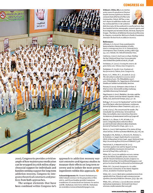 White, W. L. (2011). An addiction recovery community in the Islamic Republic of Iran: An interview with Mr. Hossein Dezhakam, founder, Congress 60. Retrieved from http://www.williamwhitepapers.com/ pr/2011%20Iran%20Mr%20Hossein%20Dezhakam.pdf