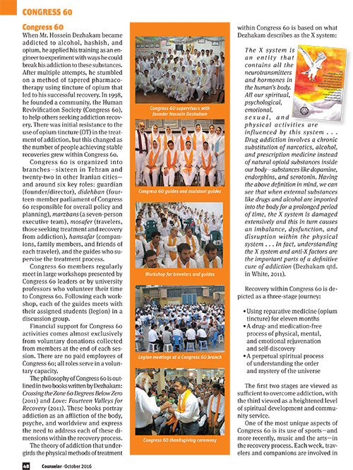در پی فعالیت کنگره 60 در ژورنالها و مجامع بین المللی علمی، مقاله ای تحت عنوان "کنگره 60 یک جمعیت ریکاوری از اعتیاد در ایران"، در مجله امریکایی مشاور (Counselor)، که نامی آشنا و بنام در حوزه اعتیاد و سلامت است به چاپ رسیده است. شروع جمع آوری و تهیه مقدمات این مقاله بیش از یک سال پیش توسط پروفسور ویلیام وایت با همکاری کنگره 60 صورت گرفته.
