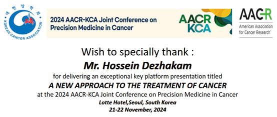 از مهندس حسین دژاکام برای ارائه کلیدی، استثنایی و جذاب مقاله "رویکردی نوین در درمان سرطان" در کنفرانس مشترک مرکز تحقیقات سرطان امریکا و کره جنوبی تحت عنوان "بهترین داروی درمان سرطان" تشکر و قدردانی ویژه مینماییم.