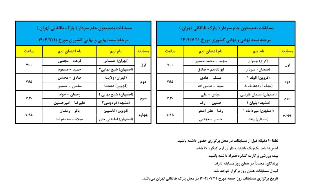 قابل توجه شرکتکنندگان و ورزشبانهای محترم نمایندگی کنگره 60؛ برنامه نهایی و فینال کشوری مسابقات بدمینتون جام سردار پارک طالقانی تهران؛