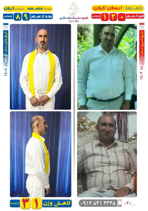 یک روز راهنمایم تخریبهای اضافهوزن و صدمات آن را بر جسمم برای من کاملاً ً شکافت و پیام لژیون تغذیه سالم را به من داد از قضا آن روز استاد جلسه راهنمای تغذیه سالم آقای ارسلان از نمایندگی گیلان به طارم آمده بودند که یکی از رهجوهایشان مرا به ایشان معرفی کرد خوشبختانه من را قبول کردند و اتفاق بزرگی در زندگی من رقم خورد باعث شد سیزده ماه از طارم به رشت رفت آمد کنم تا سفر جونز انجام بدهم و من با وزن ۱۲۱ کیلو سفر جونزم را آغاز کردم و توانستم با کمکها و راهنماییهای بیدریغ آقای ارسلان عزیز در طی سیزده ماه حدود ۳۱ کیلو وزنم را کاهش دهم.