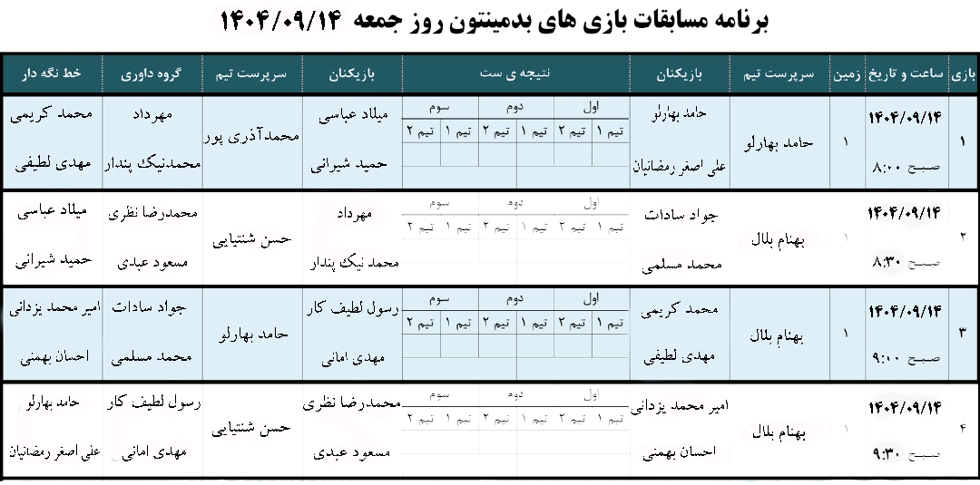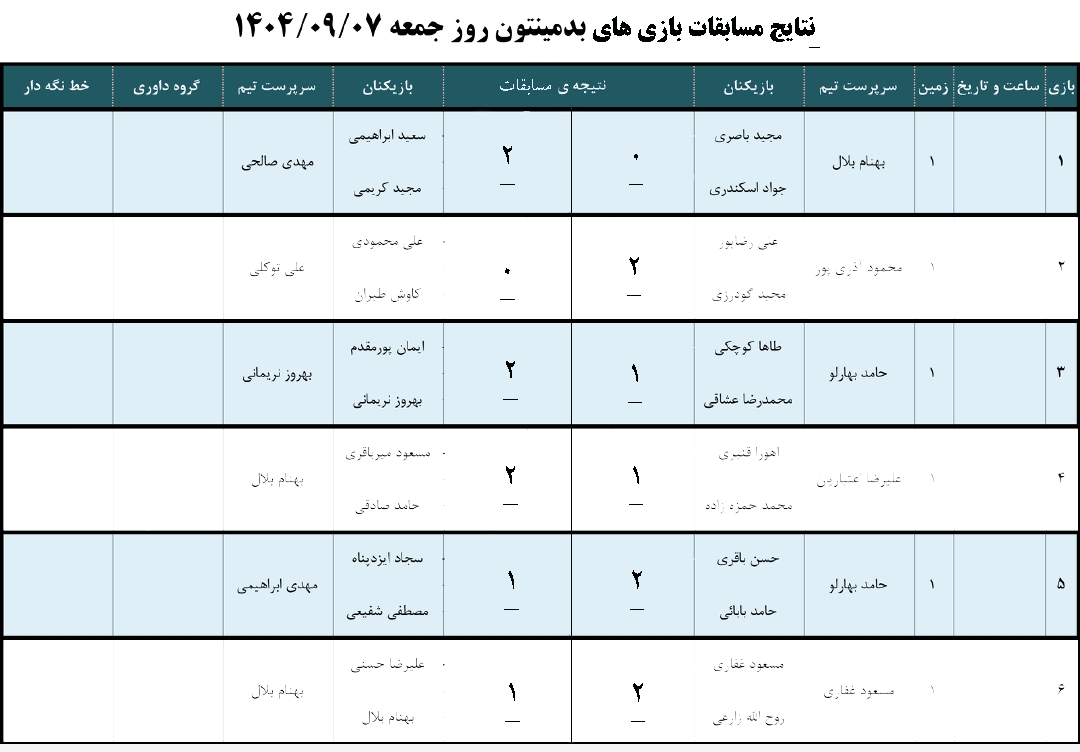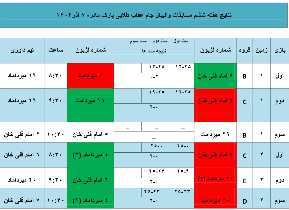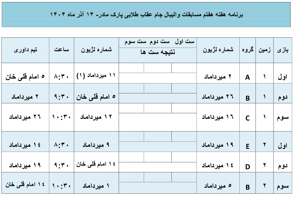 تربیت بدنی فعالیت های ورزشی و نتایج مسابقات جام عقاب طلایی بوستان مادر اصفهان مورخ 7 آذرماه 1404 منبع: پارک مادر (اصفهان) جمعه 7 آذر 1404 تعداد بازدید از این مطلب : 446 برنامه مسابقات بدمینتون جام عقاب طلایی1404/09/14 برنامه مسابقات والبیال جام عقاب طلایی 1404/09/14 نتایج مسابقات بدمینتون جام عقاب های طلایی این هفته نتایج مسابقات والیبال جام عقاب های طلایی این هفته نتایج مسابقات فوتبال جام عقاب های طلایی این هفته ورزش ایروبیک لژیون صبحانه جلسه هماهنگی ایجنت محترم مسافر حامد بهارلو با نگهبانان ورزشی بوستان مادر آبدارخانه کمک های اولیه لژیون ویلیام وایت لژیون تغذیه سالم مسابقات والیبال جام عقاب های طلایی 1404 ورزش باستانی ورزش بدمینتون ورزش تنیس رو میز ورزش شطرنج مسابقات طناب کشی جام عقاب طلایی1404 ورزش دارت مسابقات فوتسال جام عقاب های طلایی1404 منبع: پارک مادر (اصفهان) جمعه 7 آذر 1404 تعداد بازدید از این مطلب : 446 ویژه ها هشدار نایدا: وقفه در بروزرسانی و ارائه برخی از خدمات به دلیل وقفه در تأمین بودجۀ دولتی امریکا پذیرش مقاله مهندس حسین دژاکام برای ارائه در کنفرانس "مراقبت از اعصاب"،شیکاگو، امریکا (2026) گامی سرنوشتساز از سوی مهندس حسین دژاکام در درمان کووید-۱۹ و سارس ارائه مقاله جدید و برجسته مهندس حسین دژاکام در حوزه درمان اعتیاد با روش DST با دقت سلولی مولکولی در کنفرانس بین المللی درمان اعتیاد در اورلاندو، فلوری مقاله "تأثیرات رفتاری و مولکولی پروتکل دی اس تی بر مدل حیوانی اعتیاد به تریاک" از مهندس حسین دژاکام، درصدر محافل علمی دنیا مورد بررسی و پذیرش قرار گر دستاورد شگفتآور دیگری از تیم تحقیقاتی کنگره 60 در ریسرچ گیت منتشر گردید. دستاورد شگفت آور دیگری از کنگره 60، انتشار مقاله مهار متاستاز سرطان سینه به صورت short communication رویکردی نوین در درمان سرطان