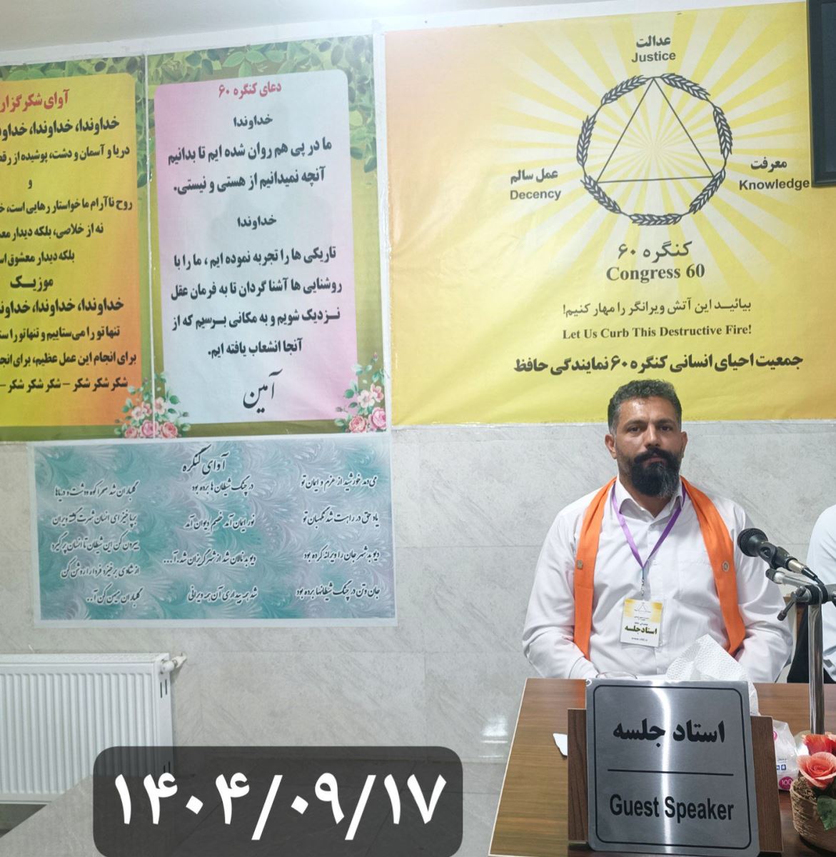 سلام دوستان میثم هستم یک مسافر از گروه مرزبانی و ایجنت محترم تشکر میکنم که اجازه دادند در این جایگاه خدمت کنم. دستور جلسه این هفته "بنیان کنگره ۶۰" میباشد و جناب آقای مهندس را همه میشناسیم و با صحبت های ایشان آشنا هستیم شاید بعضاً در طول سفر به بحث دی اس تی و اوتی و تغییر پله ها دقت کنیم و از این غافل شویم که این آموزشها و این صحبت هاست که در ما تغییر به وجود می آورد؛ اجرای جلسات یا رنگ بندی شالها و کل اتفاقها که دست به دست هم داده تا کنگره 60 به این نقطه برسد و میوه درخت مهم است که رهایی رهجوها است. این دستور جلسه در کنگره 60 بیشتر برای این است که ما با این شخصیت آشنا بشویم چرا که ایشان الگوی ما و در حقیقت راهنمای همه ما هستند. الان هر کدام از ما در لژیون یک راهنما داریم ولی در کل راهنمای اصلی کنگره 60 جناب مهندس هستند و وقتی با این شخصیت آشنا می شویم برای خودمان بهتر هست که بدانیم دنباله روی چه کسی هستیم و بدانیم که ایشان یک انسان موفقی هستند و چطور میشود این انسان وارد تاریکی اعتیاد میشوند که میتوانند خودشان را درمان کنند و با این روش این کنگره ۶۰ را به اینجا برسانند.