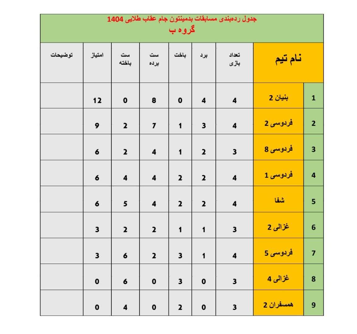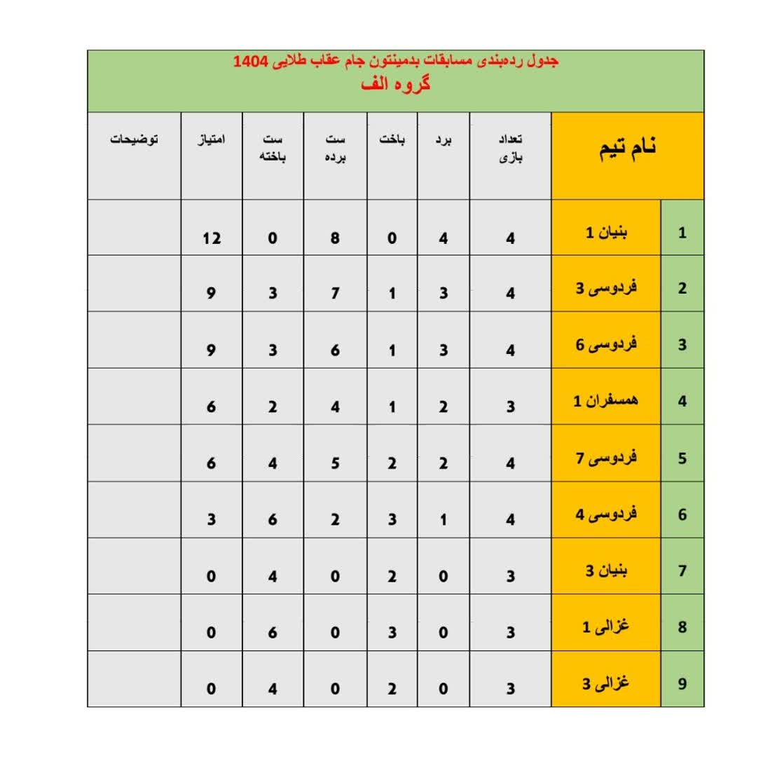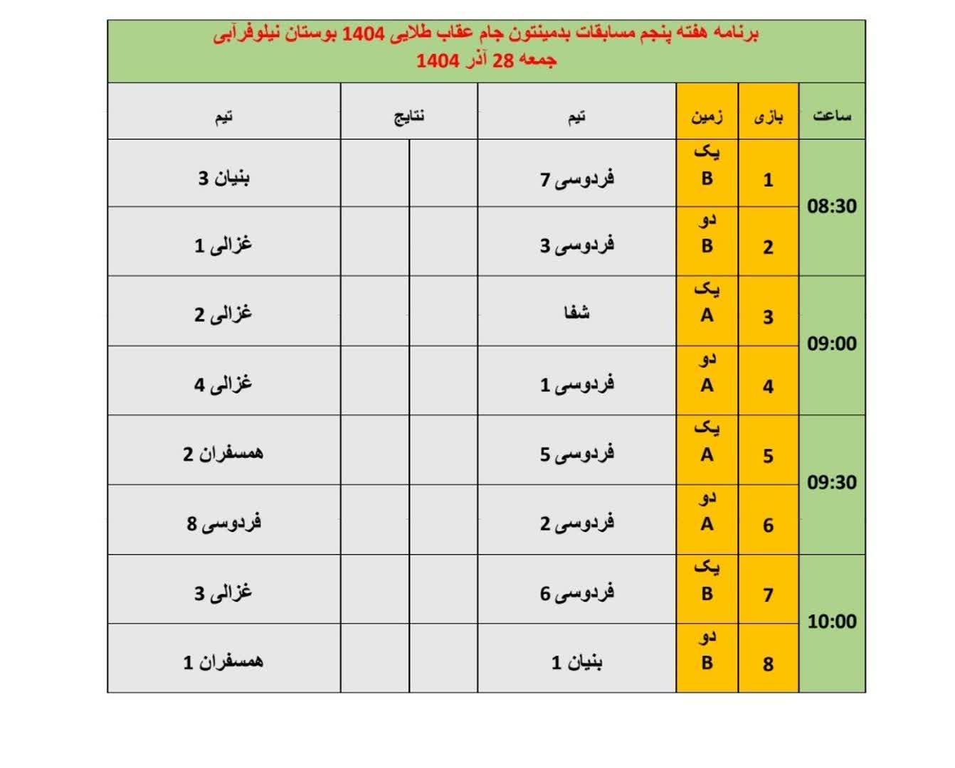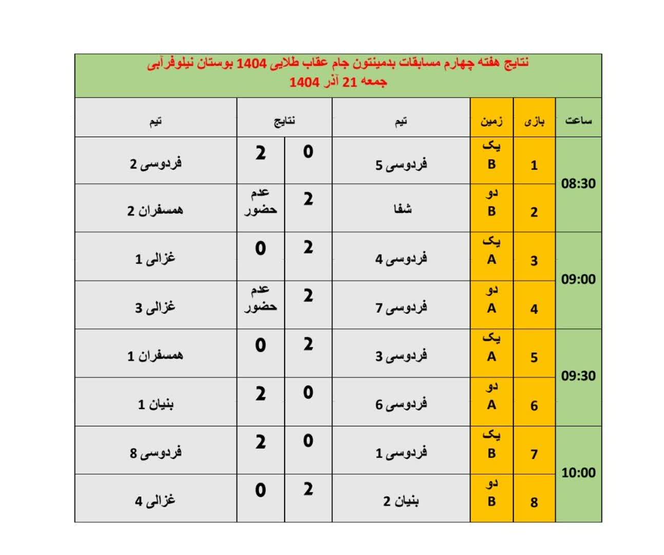 هفته چهارم مسابقات بدمینتون جام عقاب طلایی ۱۴۰۴ بوستان نیلوفرآبی روز جمعه 21 آذر پیگیری و نتایج زیر بدست آمد: