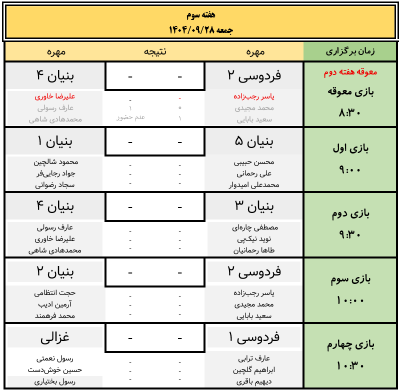 برنامه مسابقات هفته آینده شطرنج «عقاب طلایی پارک نیلوفرآبی» اعلام شد. تقابلهای مهم و بازیهای حساس پیشرو، میتواند تغییرات زیادی در جدول ایجاد کند.