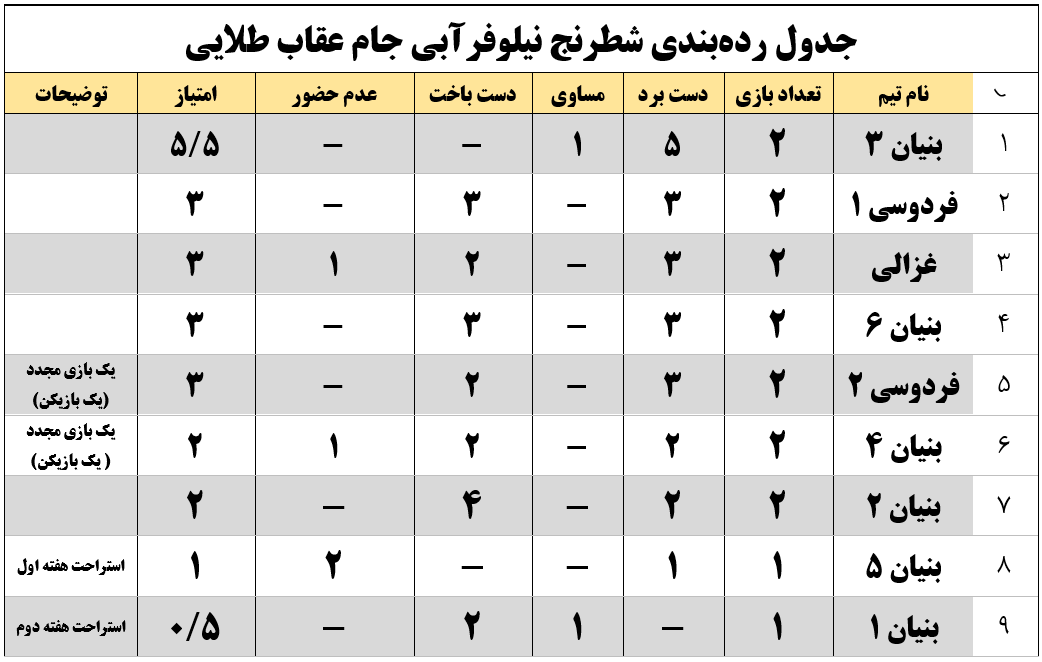 هفته دوم مسابقات شطرنج «عقاب طلایی پارک نیلوفرآبی» با بازیهایی نزدیک و هیجانانگیز برگزار شد.