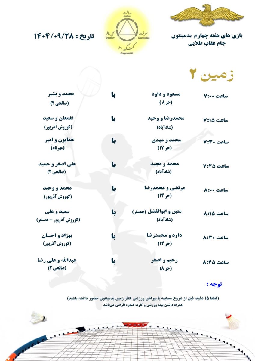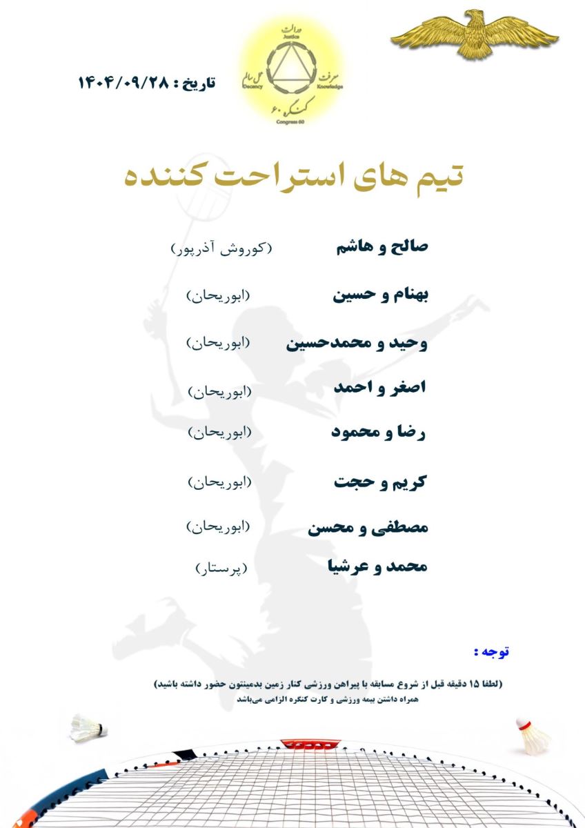 تربیت بدنی برنامه مسابقات بدمینتون جام عقاب طلایی کنگره ۶۰ در بوستان ولایت منبع: پارک ولایت (تهران) پنج شنبه 27 آذر 1404 تعداد بازدید از این مطلب : 146 برنامه هفته چهارم مسابقات بدمینتون جام عقاب طلایی کنگره ۶۰ در بوستان ولایت مورخ 1404/09/28 بار گذاری : مرزبان خبری (مسافر رحمان) منبع: پارک ولایت (تهران) پنج شنبه 27 آذر 1404 تعداد بازدید از این مطلب : 146 ویژه ها هشدار نایدا: وقفه در بروزرسانی و ارائه برخی از خدمات به دلیل وقفه در تأمین بودجۀ دولتی امریکا پذیرش مقاله مهندس حسین دژاکام برای ارائه در کنفرانس "مراقبت از اعصاب"،شیکاگو، امریکا (2026) گامی سرنوشتساز از سوی مهندس حسین دژاکام در درمان کووید-۱۹ و سارس ارائه مقاله جدید و برجسته مهندس حسین دژاکام در حوزه درمان اعتیاد با روش DST با دقت سلولی مولکولی در کنفرانس بین المللی درمان اعتیاد در اورلاندو، فلوری مقاله "تأثیرات رفتاری و مولکولی پروتکل دی اس تی بر مدل حیوانی اعتیاد به تریاک" از مهندس حسین دژاکام، درصدر محافل علمی دنیا مورد بررسی و پذیرش قرار گر دستاورد شگفتآور دیگری از تیم تحقیقاتی کنگره 60 در ریسرچ گیت منتشر گردید. دستاورد شگفت آور دیگری از کنگره 60، انتشار مقاله مهار متاستاز سرطان سینه به صورت short communication رویکردی نوین در درمان سرطان