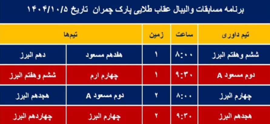 اخبار داخلی نتــایج و برنامه مسابقــات والیبال جام عقــاب طلایی منبع: پارک چمران (کرج) شنبه 29 آذر 1404 تعداد بازدید از این مطلب : 271 "بــه نام قـــدرت مطـــلق الله" نتایج مسابقات برگزار شده در روز جمعه بیستوهشتم آذرماه ۱۴۰۴ برنامه دور جدید مسابقات در تاریخ پنجم دیماه ۱۴۰۴ قرعه کشی انجام شده و نحوه صعود تیم های مراحل بعد: منبع: پارک چمران (کرج) شنبه 29 آذر 1404 تعداد بازدید از این مطلب : 271 ویژه ها هشدار نایدا: وقفه در بروزرسانی و ارائه برخی از خدمات به دلیل وقفه در تأمین بودجۀ دولتی امریکا پذیرش مقاله مهندس حسین دژاکام برای ارائه در کنفرانس "مراقبت از اعصاب"،شیکاگو، امریکا (2026) گامی سرنوشتساز از سوی مهندس حسین دژاکام در درمان کووید-۱۹ و سارس ارائه مقاله جدید و برجسته مهندس حسین دژاکام در حوزه درمان اعتیاد با روش DST با دقت سلولی مولکولی در کنفرانس بین المللی درمان اعتیاد در اورلاندو، فلوری مقاله "تأثیرات رفتاری و مولکولی پروتکل دی اس تی بر مدل حیوانی اعتیاد به تریاک" از مهندس حسین دژاکام، درصدر محافل علمی دنیا مورد بررسی و پذیرش قرار گر دستاورد شگفتآور دیگری از تیم تحقیقاتی کنگره 60 در ریسرچ گیت منتشر گردید. دستاورد شگفت آور دیگری از کنگره 60، انتشار مقاله مهار متاستاز سرطان سینه به صورت short communication رویکردی نوین در درمان سرطان