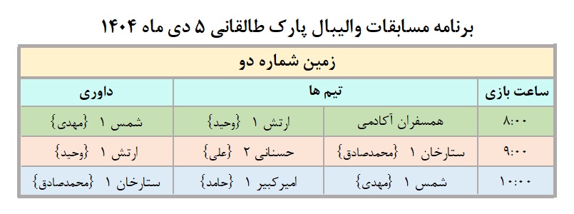 شورای ورزشی نتایج حذفی دور رفت مرحله یک شانزدهم نهایی و برنامه دور برگشت مرحله یک شانزدهم نهایی دیدارهای هفدهمین دوره جام عقاب طلائی والیبال پارک طالقانی منبع: پارک طالقانی(تهران) دوشنبه 1 دي 1404 تعداد بازدید از این مطلب : 153 نتایج حذفی (دور رفت مرحله یک شانزدهم نهایی) برنامه دور برگشت مرحله یک شانزدهم نهایی منبع: پارک طالقانی(تهران) دوشنبه 1 دي 1404 تعداد بازدید از این مطلب : 153 ویژه ها هشدار نایدا: وقفه در بروزرسانی و ارائه برخی از خدمات به دلیل وقفه در تأمین بودجۀ دولتی امریکا پذیرش مقاله مهندس حسین دژاکام برای ارائه در کنفرانس "مراقبت از اعصاب"،شیکاگو، امریکا (2026) گامی سرنوشتساز از سوی مهندس حسین دژاکام در درمان کووید-۱۹ و سارس ارائه مقاله جدید و برجسته مهندس حسین دژاکام در حوزه درمان اعتیاد با روش DST با دقت سلولی مولکولی در کنفرانس بین المللی درمان اعتیاد در اورلاندو، فلوری مقاله "تأثیرات رفتاری و مولکولی پروتکل دی اس تی بر مدل حیوانی اعتیاد به تریاک" از مهندس حسین دژاکام، درصدر محافل علمی دنیا مورد بررسی و پذیرش قرار گر دستاورد شگفتآور دیگری از تیم تحقیقاتی کنگره 60 در ریسرچ گیت منتشر گردید. دستاورد شگفت آور دیگری از کنگره 60، انتشار مقاله مهار متاستاز سرطان سینه به صورت short communication رویکردی نوین در درمان سرطان
