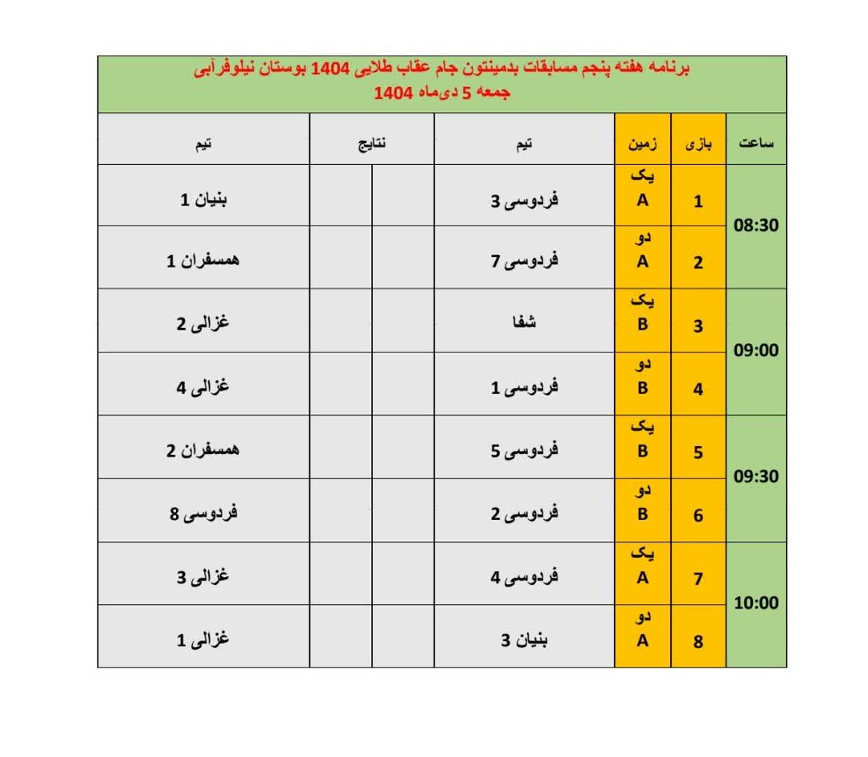 هفته پنجم مسابقات بدمینتون جام عقاب طلایی 1404 بوستان نیلوفرآبی روز جمعه 5 دیماه با انجام 8 دیدار پیگیری میگردد.