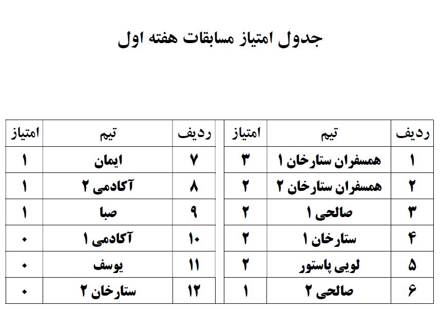 با توجه به نتایج مسابقات برگزار شده، امتیازات تیمها بدین شرح است: