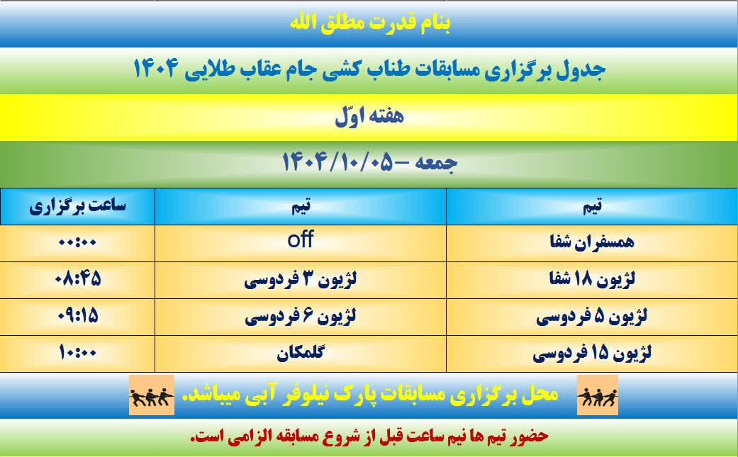 اولین هفته مسابقات در روز جمعه 5 دیماه 1404 با انجام 3 دیدار طبق جدول زیر برگزار خواهد شد.