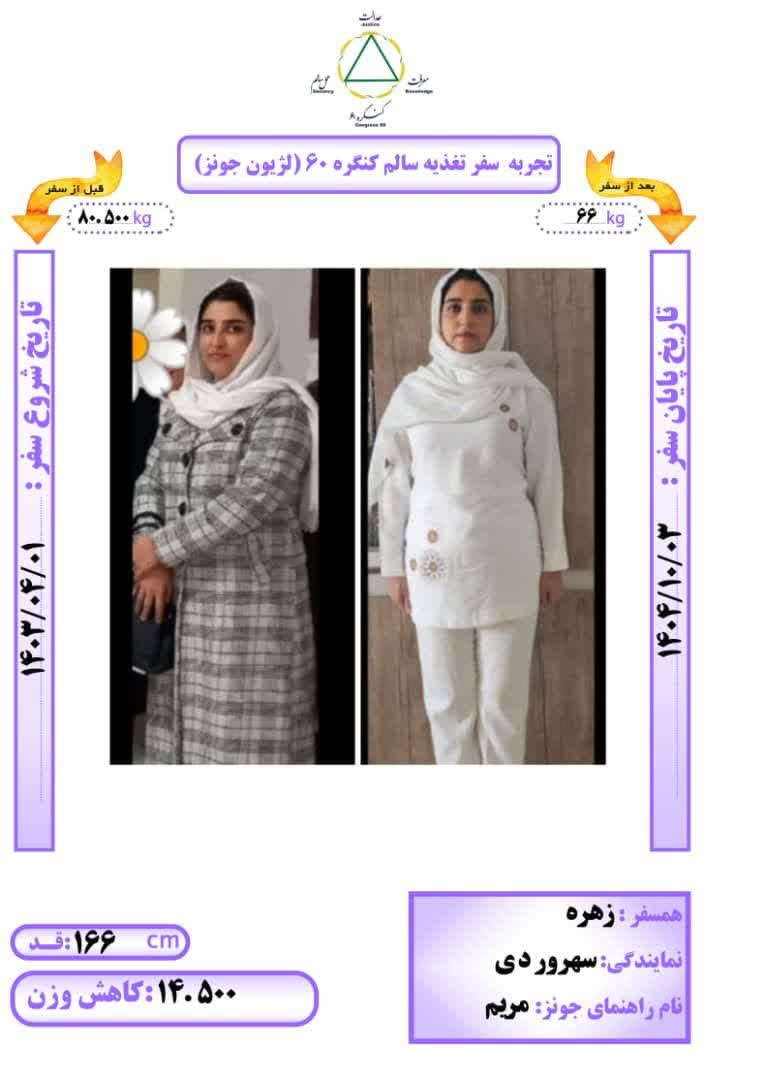 در روز چهارشنبه ۳ دی ماه ۱۴۰۴ همسفر زهره رهجوی راهنما همسفر مریم، نمایندگی سهروردی با قد ۱۶۶ سانتیمتر و وزن اولیه ۸۰/۵۰۰ کیلوگرم به مدت ۱۸ ماه و ۲ روز به روش Dezhakam سفر کردند؛ ۱۴/۵۰۰ کیلوگرم کاهش وزن داشتند و به وزن ۶۶ کیلوگرم رسیدند و با دستان پرمهر آقای مهندس آزاد و رها شدند.