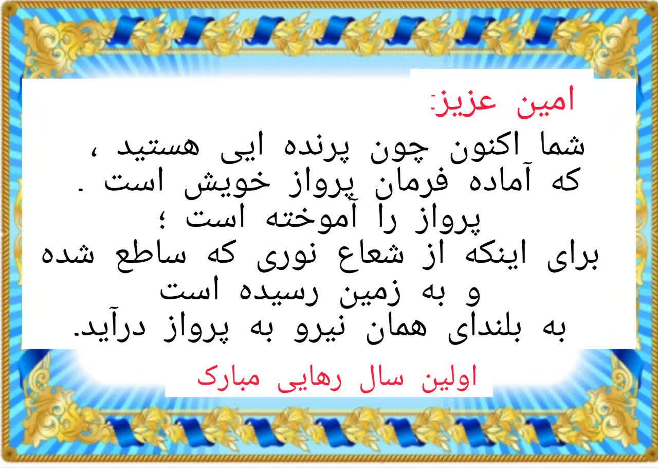 یکسال رهایی امین عزیز را به خودش، همسفر محترمش، دو همسفر عزیزشان و همچنین به راهنمای همسفرشان، خانم شفیعه، صمیمانه تبریک عرض میکنم.