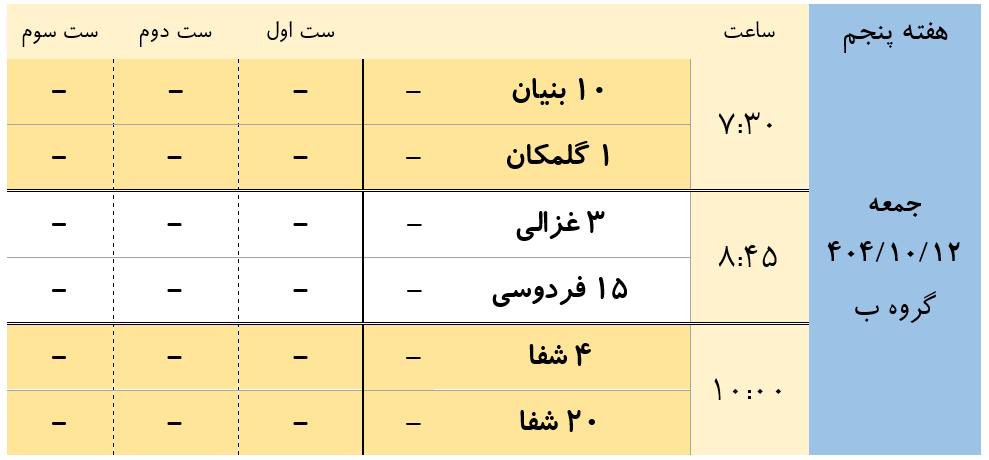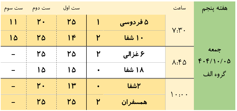 نتایج کامل بازیهای هفته پنجم گروه الف در جدول زیر قابل مشاهده است؛