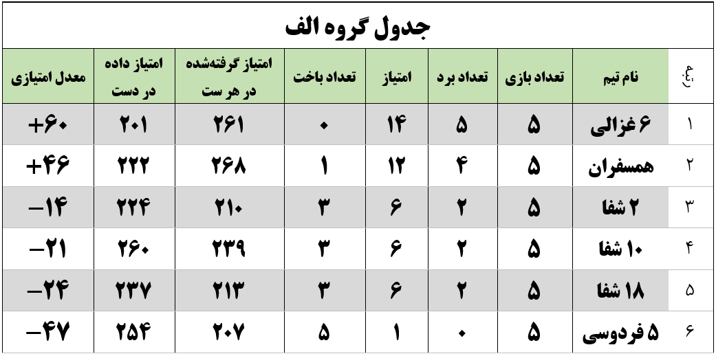 جدول نهایی ردهبندی گروهالف به شرح زیر اعلام میگردد: