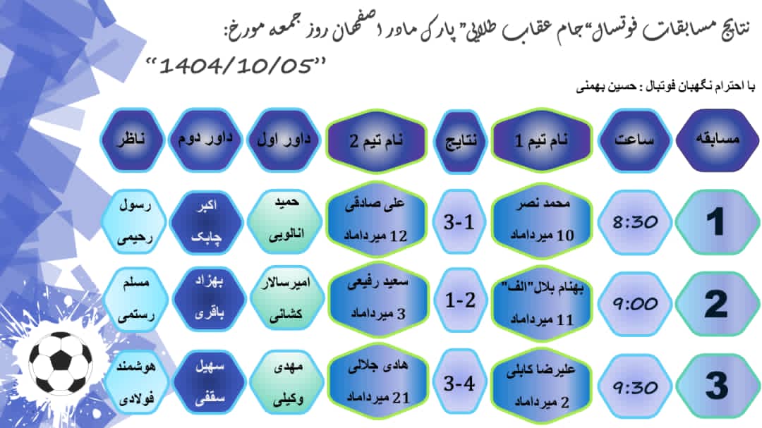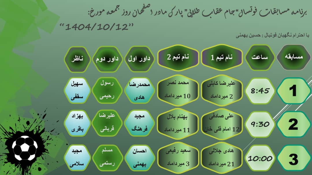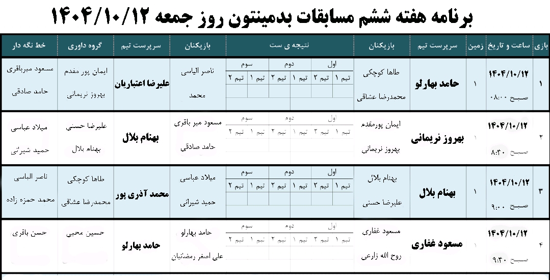 تربیت بدنی فعالیت های ورزشی پارک بوستان مادر اصفهان روز جمعه مورخ 5دی ماه1404 منبع: پارک مادر (اصفهان) جمعه 5 دي 1404 تعداد بازدید از این مطلب : 40 برنامه و نتایج مسابقات بدمینتون جام عقاب طلایی1404 برنامه و گروه بندی و نتایج مسابقات والیبال جام عقاب طلایی1404 برنامه و نتایج مسابقات فوتسال جام عقاب طلایی1404 مسابقات ورزشی تمامی رشته ها از طرف ایجنت محترم و مرزبانان بوستان مادر از حضور شما همسفران و مسافران و خدمتگزاران تشکر میکنیم و هفته خوبی را سپری کنید. تهیه و تنظیم:مسافر عباس عکاس:مسافر احسان و مسافر عباس ارسال:مسافر مهدی منبع: پارک مادر (اصفهان) جمعه 5 دي 1404 تعداد بازدید از این مطلب : 40 ویژه ها هشدار نایدا: وقفه در بروزرسانی و ارائه برخی از خدمات به دلیل وقفه در تأمین بودجۀ دولتی امریکا پذیرش مقاله مهندس حسین دژاکام برای ارائه در کنفرانس "مراقبت از اعصاب"،شیکاگو، امریکا (2026) گامی سرنوشتساز از سوی مهندس حسین دژاکام در درمان کووید-۱۹ و سارس مقاله "تأثیرات رفتاری و مولکولی پروتکل دی اس تی بر مدل حیوانی اعتیاد به تریاک" از مهندس حسین دژاکام، درصدر محافل علمی دنیا مورد بررسی و پذیرش قرار گر ارائه مقاله جدید و برجسته مهندس حسین دژاکام در حوزه درمان اعتیاد با روش DST با دقت سلولی مولکولی در کنفرانس بین المللی درمان اعتیاد در اورلاندو، فلوری دستاورد شگفتآور دیگری از تیم تحقیقاتی کنگره 60 در ریسرچ گیت منتشر گردید. دستاورد شگفت آور دیگری از کنگره 60، انتشار مقاله مهار متاستاز سرطان سینه به صورت short communication رویکردی نوین در درمان سرطان