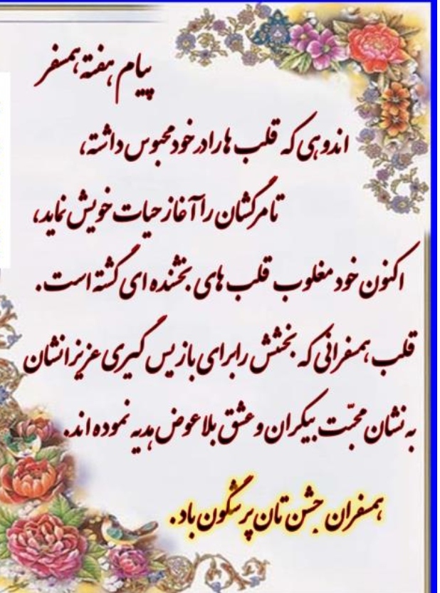 با تبریک هفته همسفر، خدمت همه همسفران کنگره۶۰ به اطلاع میرسانیم جشن هفته همسفر روز پنجشنبه ۱۱ دیماه ۱۴۰۴ ساعت ۱۷:۰۰ باشکوه هر چه تمام برگزار میگردد. از همه شما همسفران درخواست میگردد حتماً یک ساعت قبل از شروع کارگاه آموزشی با پوشش مناسب در نمایندگی حضور داشته باشید تا در کنار همدیگر لحظات بهیادماندنی را برای یکدیگر رقم بزنیم.
