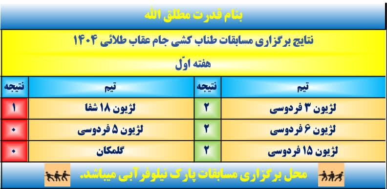 اولین هفته مسابقات طنابکشی جام عقاب طلایی در روز جمعه ۵ دیماه ۱۴۰۴ با انجام ۳ دیدار برگزار و نتایج زیر بدست آمد.