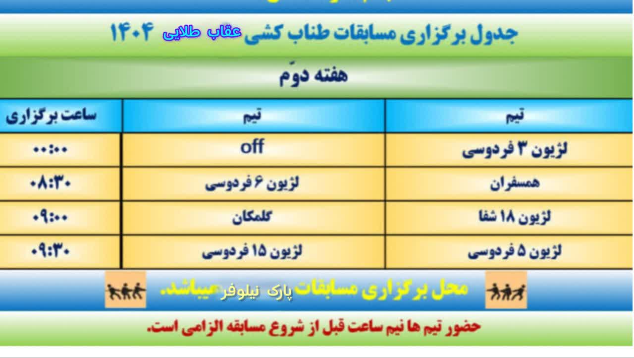 هفته دوم این مسابقات روز جمعه 12 دیماه طبق جدول زیر برگزار میگردد.