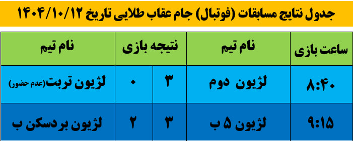 رقابت های جام عقاب طلایی بوستان بسیج نمایندگی کاشمر در روز جمعه مورخه 1404/10/12 ادامه و نتایج ذیل بدست آمد: