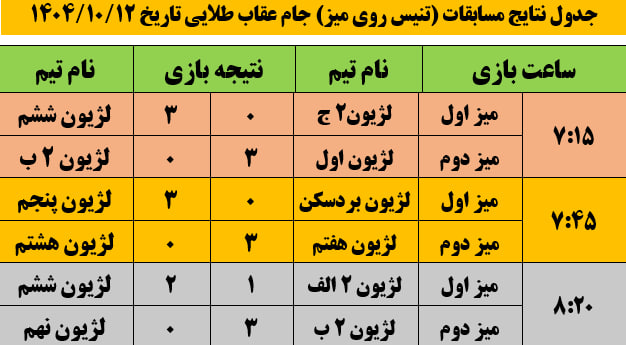 مسابقات ورزشی در رشته تنیس روی میز در سه تایم در دو میز انجام گردید که نتایج به شرح ذیل اعلام می گردد: