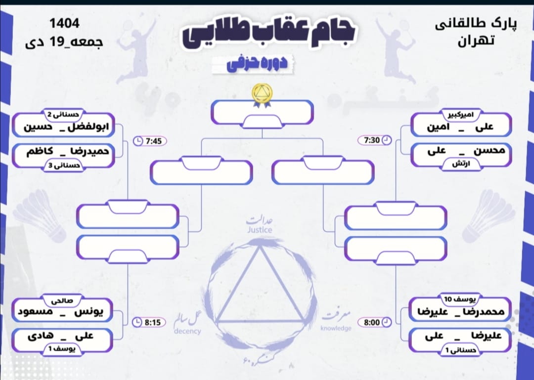 برگزاری دوره حذفی مسابقات بدمینتون جام عقاب طلایی پارک طالقانی تهران روز جمعه مورخ 1404/10/19 برگزار خواهد شد.