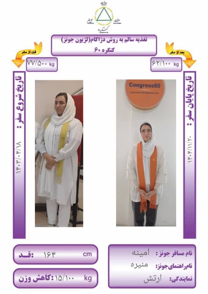 در روز دوشنبه ۲۰ بهمنماه ۱۴۰۴ همسفر امینه رهجوی راهنما همسفر منیره از نمایندگی ارتش با قد ۱۶۴ سانتیمتر و وزن اولیه ۷۷/۵۰۰ کیلوگرم به مدت ۱ سال و ۷ ماه و ۲ روز به روش Dezhakam سفر کردند؛ ۱۵/۱۰۰ کیلوگرم کاهش وزن داشتند و به وزن ۶۲/۱۰۰ کیلوگرم رسیدند و با دستان پرمهر آقای مهندس آزاد و رها شدند.