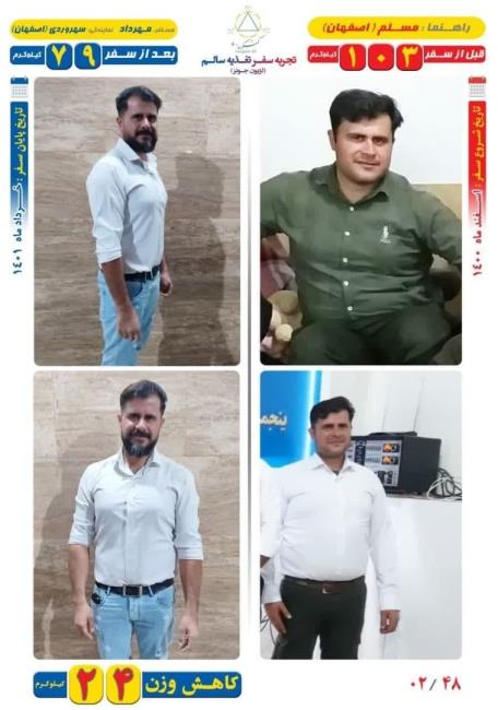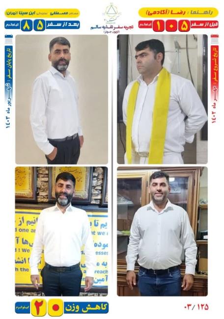 کاهش و افزایش وزن 20 کیلوگرم کاهش وزن مسافر مصطفی به روش Dezhakam سه شنبه 7 بهمن 1404 قبل از سفر: 105 کیلوگرم ، بعد از سفر: 85 کیلوگرم