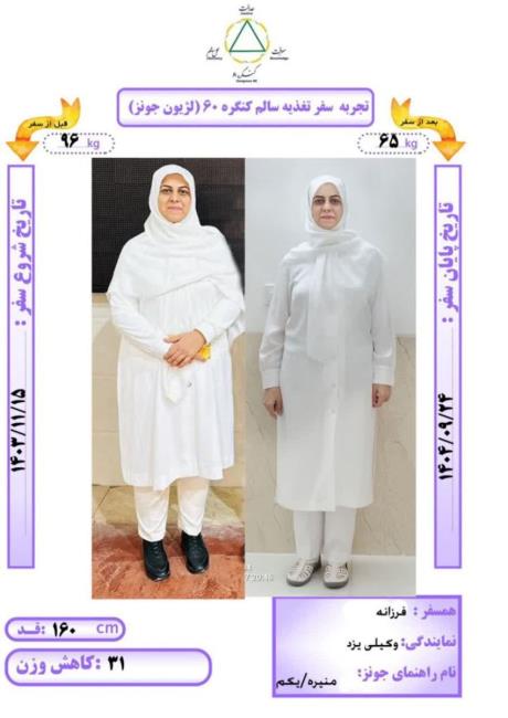 کاهش و افزایش وزن ۳۱ کیلوگرم کاهش وزن به روش Dezhakam چهار شنبه 17 دي 1404 مسافر لژیون تغذیه سالم همسفر فرزانه رهجوی راهنما همسفر منیره از نمایندگی وکیلی یزد به کاهش وزن به روش Dezhakam رسید.