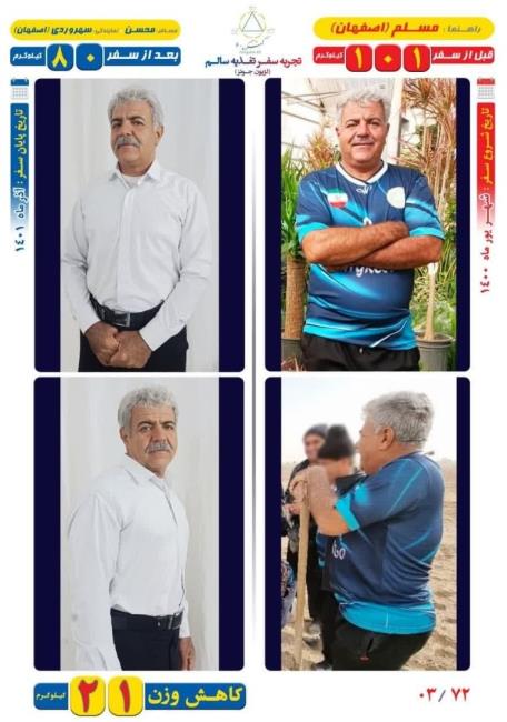 کاهش و افزایش وزن 21 کیلوگرم کاهش وزن مسافر محسن به روش Dezhakam سه شنبه 28 بهمن 1404 قبل از سفر: 101 کیلوگرم ، بعد از سفر: 80 کیلوگرم